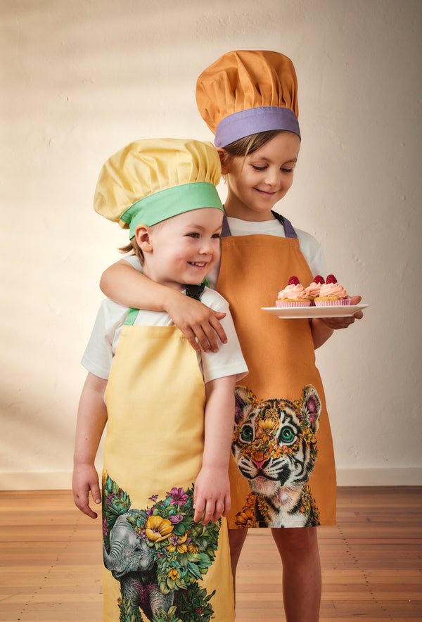 Get wild in the kitchen with this children’s apron and hat set from the Wild Planet collection. Created in collaboration with artist Marini Ferlazzo, it features a beautiful illustration of a young elephant, embellished with lush flowers and foliage. Colourful and full of fun, it helps protect clothes and hair from even the messiest baking session. Made from 100% cotton, it’s essential for any junior chef.