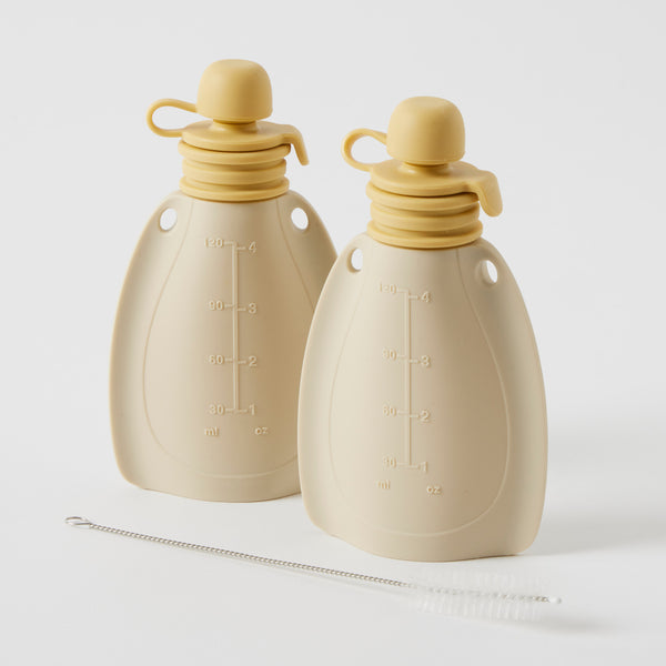 Little ones will love the Mikko Smoothie Squeezy Set of 2! Comes with handy measurement markings and made from soft silicone material that will be gentle on little hands and teeth. Set includes a bottle brush for easy cleaning.