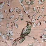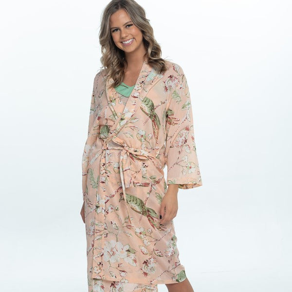 Our peach blossom dressing gown features birds with soft green plumes sitting on branches budding into cream blooms against a peach background. This dressing gown has 2 front pockets and it has a long belt to tie around the waist.