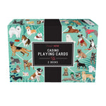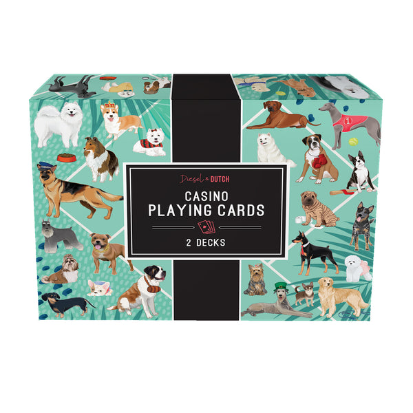 Two 54 piece quality casino playing card decks, with cards featuring 54 different dog breeds. Hours of fun and entertainment playing with 3.5 x 2.4 inch playing cards. After play, the cards can be packed away in the storage tray and box for next time.