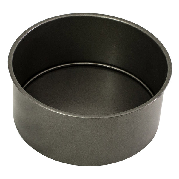 A heavy duty round cake pan ideal for making sponge and fruit cakes features a double non-stick coating and loose base for easy release.