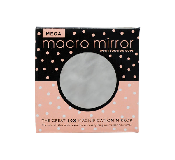MAGNIFY YOUR WORLD, with our Mega Macro Mirror, 10x magnified mirror. Complete with suction caps to mount on a mirror or glass surface. Size 13cm
